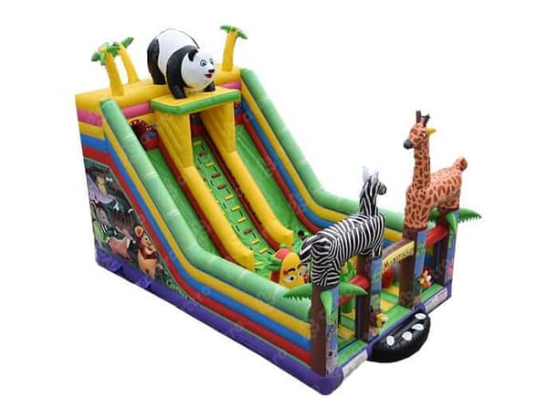 Αυτό το εντυπωσιακό φουσκωτό παιχνίδι με θέμα τη ζούγκλα προσφέρει ατελείωτη διασκέδαση με τσουλήθρες, εμπόδια και εντυπωσιακές φιγούρες ζώων όπως καμηλοπαρδάλεις, ζέβρες και πάντα! Ιδανικό για παιδικά πάρτι, εκδηλώσεις και φεστιβάλ, εξασφαλίζει ατελείωτες ώρες παιχνιδιού και δράσης σε ένα ασφαλές και πολύχρωμο περιβάλλον.